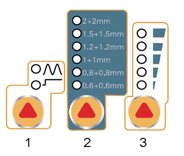 Кнопка 1 - выбор между непрерывным и импульсным режимом работы. Кнопка 2 – выбор толщины листа. Кнопка 3 – корректировка времени точечной сварки. |