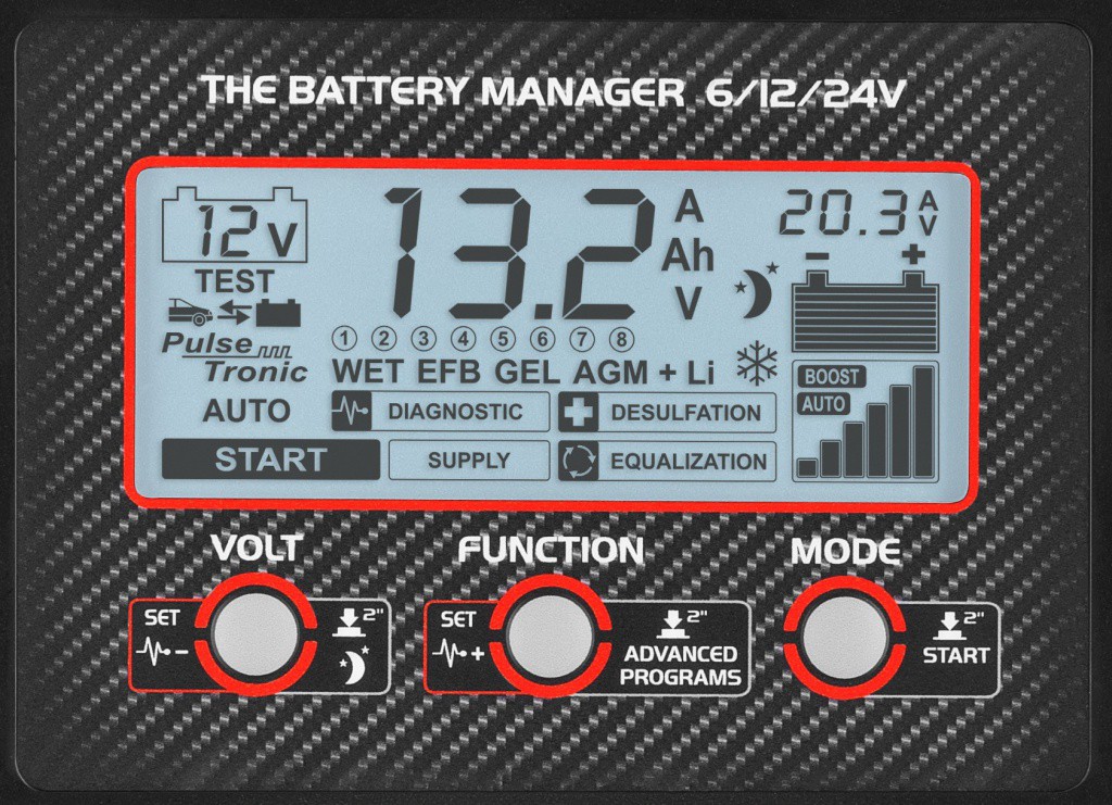 - Выбор режима: ручного, автоматического, быстрого заряда BOOST и быстрого пуска